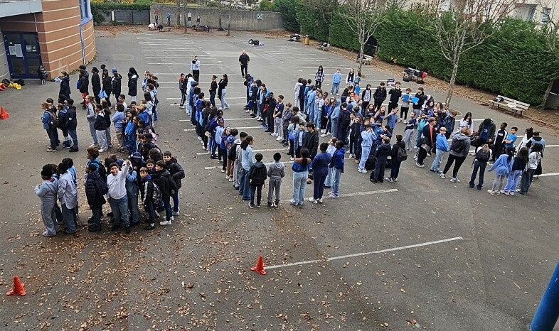 Photo collective : une photo de groupe recréant le 3018 (numéro harcèlement) prise dans la cour